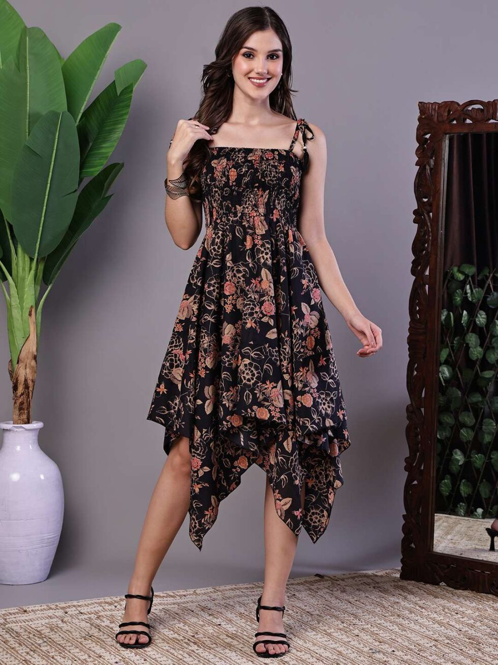 Be the first to review “Women’s Black Floral Printed Cotton Handkerchief Hem Dress Midi Dresses”